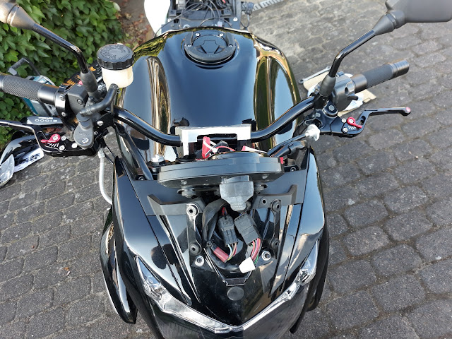 Auf dem Plan stehen ein neues Windschild, neue Aussenspiegel, neue Hinterradabdeckung mit Kettenkast, neue dunkle Blinker und Rückleuchte, Sturzpads, Umbau auf Einsitzer mit Heckverkleidung und als krönender Abschluss eine digitale Ganganzeige. Zusätzlich sollen alle grauen Aufkleber gegen goldene getauscht werden, damit das Motorrad besser zum Auto passt. Ansonsten haben die Vorbesitzer schon einige Umbauten gemacht die wir wohl irgendwann auch gemacht hätten. Dazu gehören ein Sportauspuff anstelle der originalen Klappenanlage, verstellbare Brems- und Kupplungshebel, breiterer Lenker, andere Griffe und ein schlankerer Kennzeichenhalter.