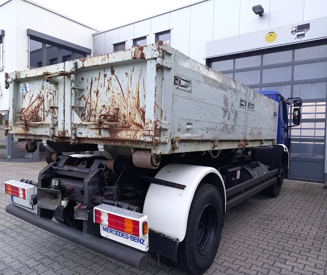 In unserem Ort gibt es leider keine öffentlichen Waschboxen in die so ein Lkw rein passt. Und eine professionelle Lkw-Waschanlage ist uns dann doch zu teuer. Die Lösung für unser Problem findet sich in Form einer nahegelegenen Lkw-Werkstatt wo wir den Waschplatz gegen eine Spende in die Kaffeekasse für ein paar Minuten benutzen dürfen. Das gibt uns genügend Zeit die stark verschmutze Hydraulik und Schmierstellen am Fahrgestell sowie den Vogeldreck und Moosbewuchs von der Kabine zu beseitigen. Zuhause folgt dann die Feinarbeit mit Kusntstoffpflege für den Kühlergrill und Schleifvlies in Verbindung mit Balistol um die rostigen hinteren Kotflügel mittelfristig etwas besser aussehen zu lassen. Einfach mit dem Schleifvlies den Flugrost abschleifen und dann mit Balistol alles versiegeln.